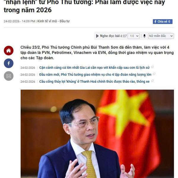 Doanh nghiệp lớn nhất Việt Nam và 3 tập đoàn khác "nhận lệnh" từ Phó Thủ tướng: Phải làm được việc này trong năm 2026 Chiều 23/2, Phó Thủ tướng Chính phủ Bùi Thanh Sơn đã đến thăm, làm việc với 4 tập đ...Thêm