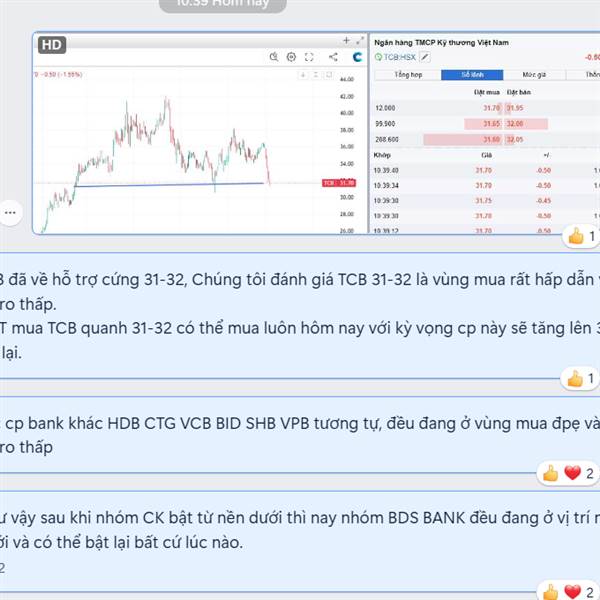 TCB đã về hỗ trợ cứng 31-32, Chúng tôi đánh giá TCB 31-32 là vùng mua rất hấp dẫn và rủi ro thấp. NDT mua TCB quanh 31-32 có thể mua luôn hôm nay với kỳ vọng cp này sẽ tăng lên 35 trở lại...Thêm