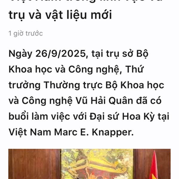 Thông tin mới nhất về hợp tác giữa Việt nam và mỹ về vật liệu mới cụ thể là khoáng sản và vũ trụ.kế hoạch chi tiết cụ thể vào tuần sau se có . Moi người tham khảo nhé!