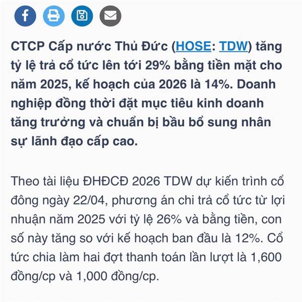 - LNST sau lợi ích CĐTS hợp nhất sơ bộ quý 1/2026 +59% YoY (hoàn thành 21% dự báo năm 2026 của chúng tôi) nhờ tăng trưởng sản lượng nước thương phẩm, lỗ tỷ giá thấp hơn và lợi nhuận được chia t...Thêm