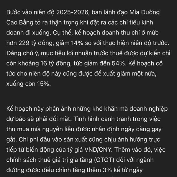 CTCP Mía Đường Cao Bằng (Cabasu, UPCoM: CBS) trình cổ đông kế hoạch trả cổ tức tiền mặt lên đến 30% cho niên độ tài chính 2024-2025. Tuy nhiên, bức tranh kinh doanh của doanh nghiệp lại đang đối mặt với dự báo lợi nhuận giảm hơn một nửa, xuống mức thấp nhất trong nhiều năm.
