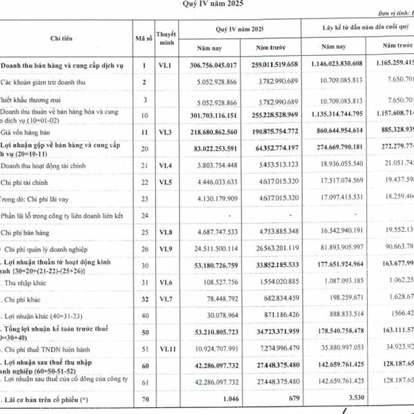 Lũy kế cả năm 2025, doanh thu thuần của doanh nghiệp đạt hơn 1.656 tỷ đồng, tăng 14% so với năm 2024. Lợi nhuận trước thuế đạt 460 tỷ đồng và lợi nhuậ
