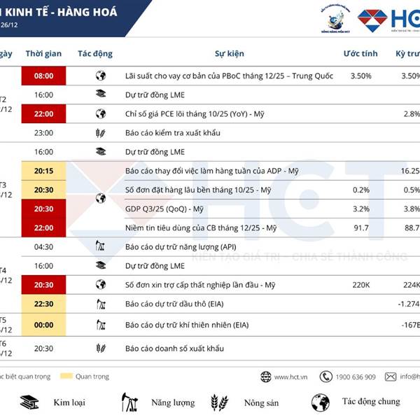 GIAO DỊCH DỊP LỄ & NHỮNG ĐIỂM CẦN THEO DÕI TRONG TUẦN --------- Tuần trước Giáng sinh, thị trường bước vào giai đoạn thanh khoản thấp – dòng tiền thận trọng. Các Sở giao dịch lớn (ICE, CME, LME) nghỉ s...Thêm
