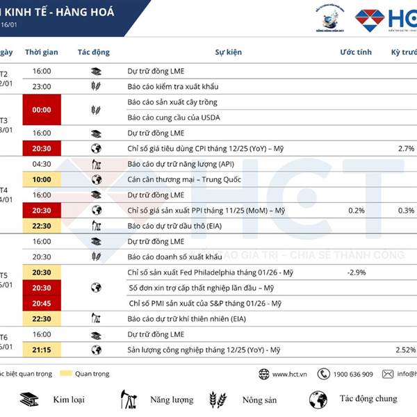 🧨 LỊCH KINH TẾ TUẦN 12/01 – 16/01: "BÃO" USDA ĐỔ BỘ & PHÁN QUYẾT TỪ CPI MỸ Tuần định đoạt xu hướng: Nông sản dậy sóng – Vĩ mô nín thở ------- Thị trường hàng hóa tuần này sẽ bước vào giai đoạn "khốc li...Thêm