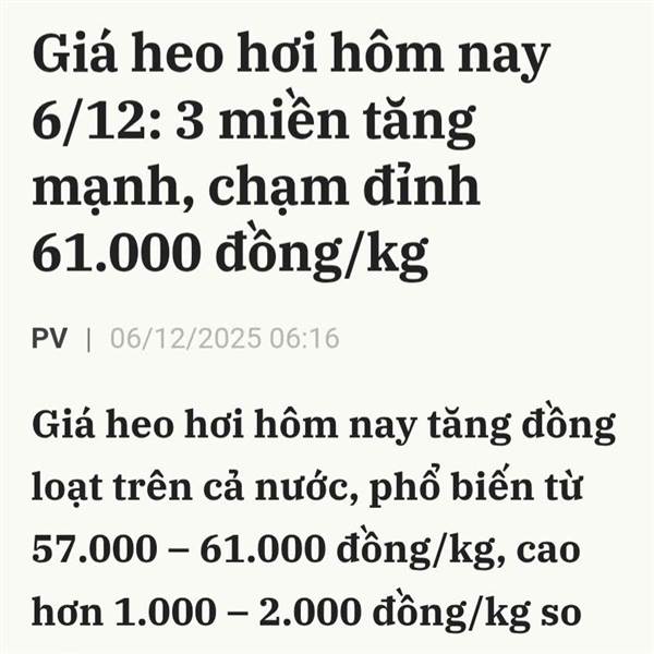 Giá heo hơi hôm nay ngày 6/12 tiếp tục tăng mạnh trên cả ba miền, với mức điều chỉnh phổ biến từ 1.000 đồng/kg đến 2.000 đồng/kg tại nhiều địa phương. Miền Bắc tiếp tục dẫn đầu về giá với mức cao nhất 61.000 đồng/kg, trong khi miền Trung và miền Nam cũng đồng loạt tăng giá.