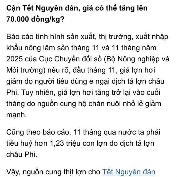 Chỉ trong 11 tháng, nước ta đã phải tiêu hủy hơn 1,23 triệu con lợn do dịch tả lợn châu Phi, chưa kể thiệt hại do mưa lũ. Vậy, nguồn cung cho Tết Nguyên đán 2026 có thiếu hụt đẩy giá thịt lợn tăng mạnh?