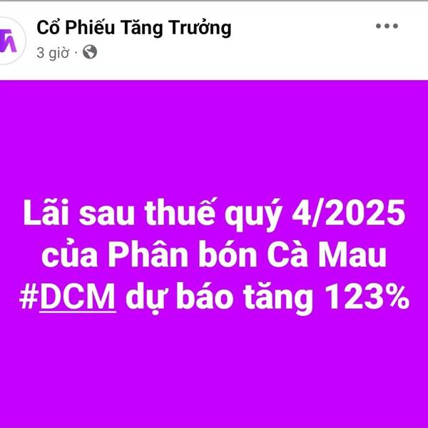 Các chuyên gia FPT Securities dự báo kết quả kinh doanh quý 4/2025 của Phân bón Cà Mau (DCM) tiếp tục xu hướng tích cực với doanh thu và lãi sau thuế tăng lần lượt 4% và 123% so với cùng kỳ.
