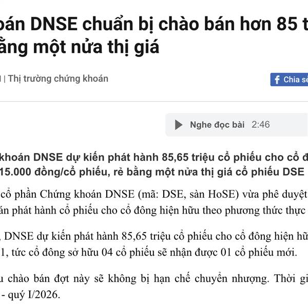Chứng khoán DNSE dự kiến phát hành 85,65 triệu cổ phiếu cho cổ đông hiện hữu với giá 15.000 đồng/cổ phiếu, rẻ bằng một nửa thị giá cổ phiếu DSE hiện tại.