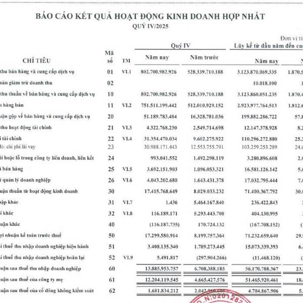 Năm 2025 ghi nhận bước nhảy vọt mạnh mẽ của doanh nghiệp khi doanh thu tăng trưởng hơn 67%, đạt gần 3.124 tỷ đồng. Đặc biệt, lợi nhuận sau thuế vượt mốc 56 tỷ đồng, tăng hơn 2,3 lần so với năm trước, ...Thêm