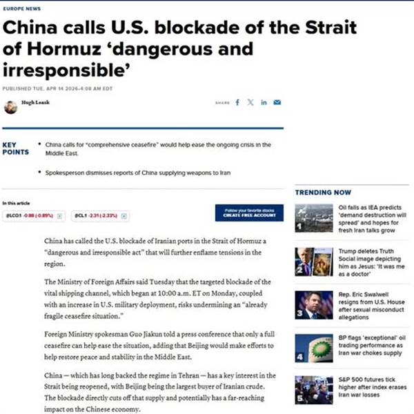🇨🇳 Trung Quốc vừa chỉ trích việc Mỹ phong tỏa các cảng Iran tại eo biển Hormuz là hành động “nguy hiểm và thiếu trách...