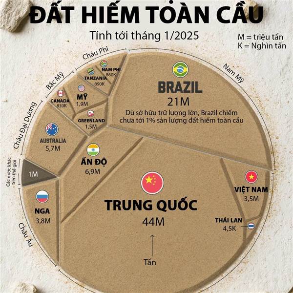 Theo Cục Khảo sát địa chất Mỹ, Việt Nam có kho báu đất hiếm với trữ lượng khoảng 22 triệu tấn, tức là lớn thứ 2 thế giới, chỉ xếp sau Trung Quốc (44 triệu tấn).