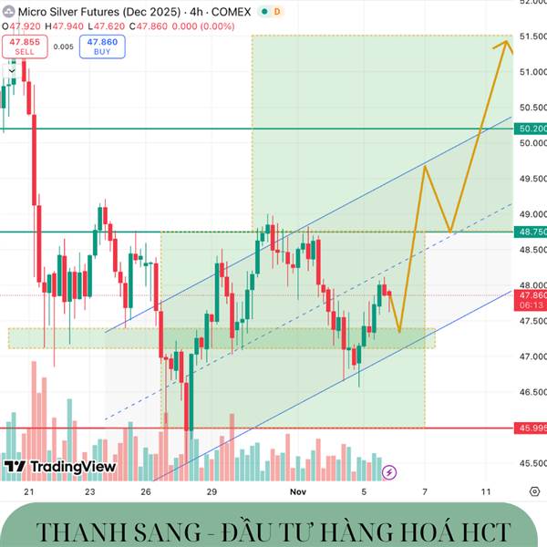 📈 BẠC (SIEZ25) NGÀY 04/11/2025: ------------------------------------------------- - Chiến lược giao dịch: nhà đầu tư có thể canh mua vùng hỗ trợ 47.8 – 48.0, chốt lời quanh 49.8 – 50.0 USD.