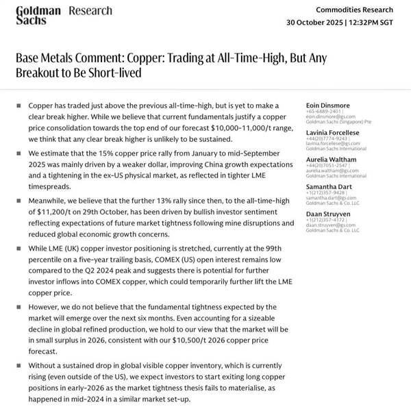 Goldman dự báo giá đồng LME sẽ dao động trong vùng 10.000–11.000 USD/tấn, và cho rằng bất kỳ đợt tăng nào vượt vùng này khó kéo dài. Đợt tăng 15% từ tháng 1 đến giữa tháng 9/2025 chủ yếu nhờ: Đồng USD y...Thêm
