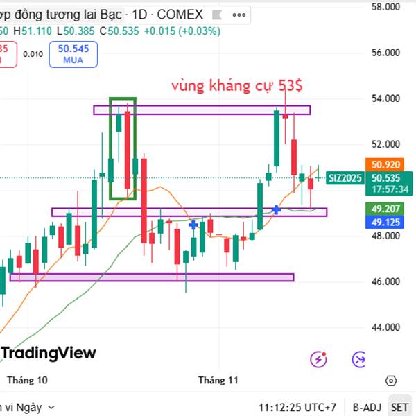 Nhận định ngày 12/11 hoàn toàn chính xác – sau khi vượt mốc 50 USD/oz, bạc tiếp tục tăng mạnh, hiện quanh 53,4 USD/oz, tương đương 56 triệu đồng/kg.