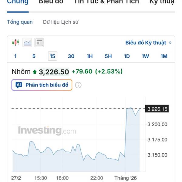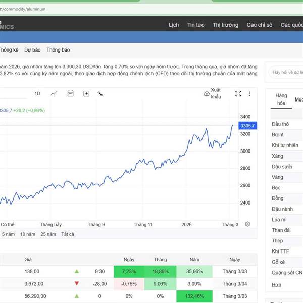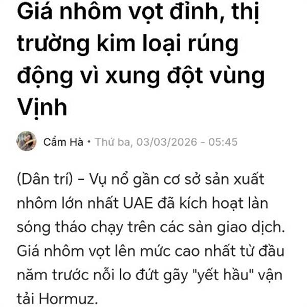 VTV.vn - Giá nhôm trên Sàn giao dịch kim loại London tăng mạnh do lo ngại xung đột Trung Đông làm gián đoạn nguồn cung qua eo biển Hormuz, đẩy thị trường kim loại biến động.