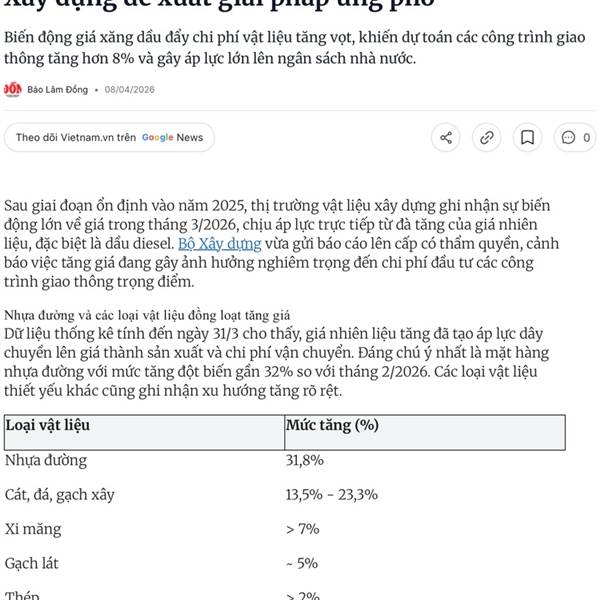 Giá xăng dầu tăng kéo theo sự tăng giá của một số loại vật liệu xây dựng. Tính đến ngày 31/3, sự tăng giá của nhiên liệu đã tạo áp lực dây chuyền lên giá thành sản ...Thêm