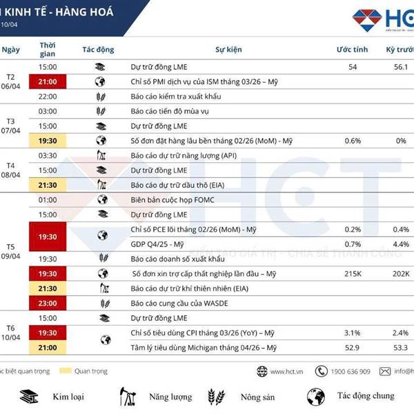 Tiêu điểm Lịch kinh tế Hàng hóa (06 - 10/04/2026) Tuần này, thị trường hàng hóa sẽ biến động mạnh quanh trục Lạm phát - Địa chính trị - Sức khỏe dịch vụ.