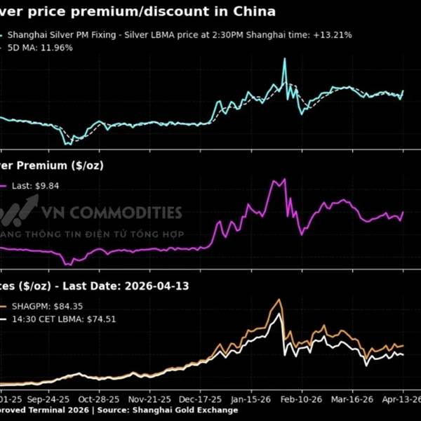 Chênh lệch giá bạc giữa thị trường Thượng hải và LBMA đang gia tăng, với chênh lệch của bạc tại Thượng hải đạt +13.2%, tương đương 9.84 USD/oz. Giá bạc tại Trung Quốc hiện đạt 84.35 USD/oz, cao hơn so...Thêm