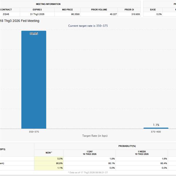 🔔 TIN NÓNG: FED QUYẾT ĐỊNH LÃI SUẤT & TÁC ĐỘNG NHÓM KIM LOẠI QUÝ Dựa trên dữ liệu mới nhất từ CME FedWatch, thị trường đang đặt cược gần như tuyệt đối (98,9%) vào kịch bản Fed sẽ giữ nguyên lãi suất ở...Thêm