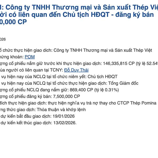 Như vậy là Thép Việt bán 7.5tr cổ để giảm sở hữu xuống 49.9%. Phương thức giao dịch thỏa thuận chứ bán giá này đc mấy chục tỉ chưa bõ dính răng. Mà lý do là thực hiện nghĩa vụ trả nợ cho Pom, nghĩa là...Thêm