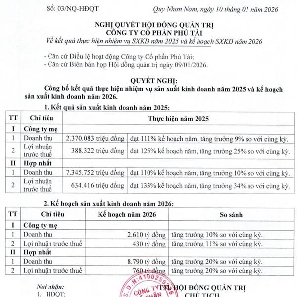 CTCP Phú Tài (PTB) vừa công bố kết quả kinh doanh sơ bộ năm 2025 với nhiều điểm tích cực, trong đó lợ...Thêm