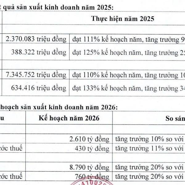 Lợi nhuận trước thuế của PTB năm 2025 tăng trưởng 34% so với cùng kỳ. Kế hoạch kinh doanh 2026 đặt mục tiêu tăng trưởng 20%.