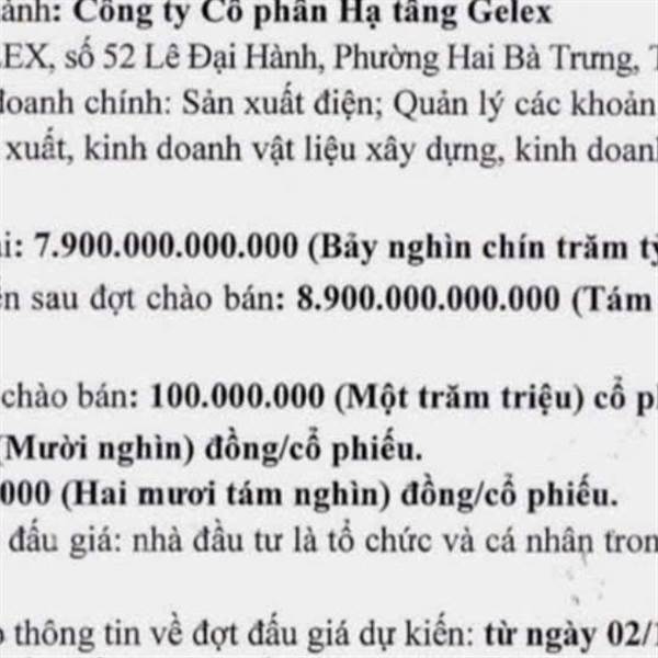 Theo kế hoạch, CTCP Hạ tầng GELEX sẽ chào bán 100 triệu cổ phiếu lần đầu ra công chúng thông qua phương thức đấu giá công khai với giá khởi điểm 28.000 đồng/cổ phiếu.