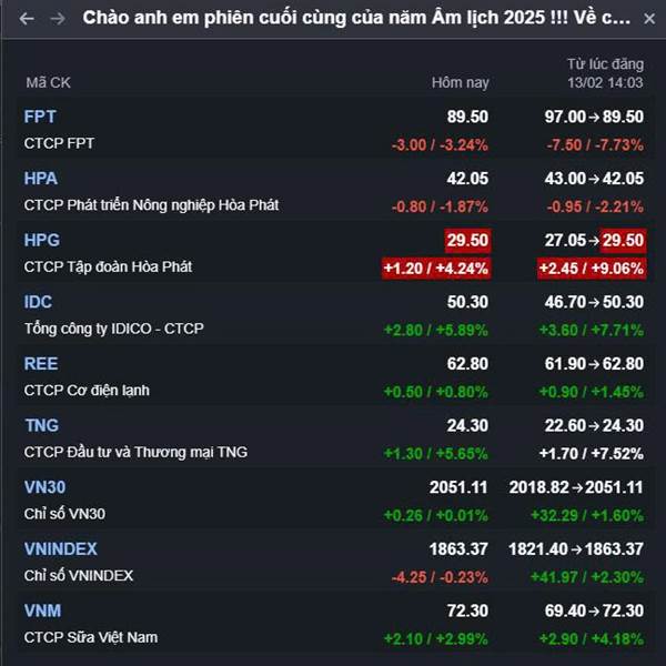 Góc khảo sát: tính từ phiên cơ cấu Danh mục cuối cùng để đón sau Tết Các anh em đồng hành đã có thành quả với CP nào, hay xui rủi dính phải FPT cùng mình :))). Hãy cho nhau biết sau 3 phiên đầu năm