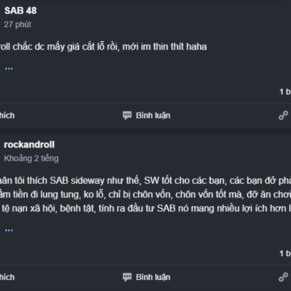 Bản thân tôi thích SAB sideway như thế, SW tốt cho các bạn, các bạn đở phải tốn sức cầm tiền đi lung tung, ko lỗ, chỉ bị chôn vốn, chôn vốn tốt mà, đỡ ăn chơi, tránh sa lầy tệ nạn xã hội, bệnh tật, tí...Thêm