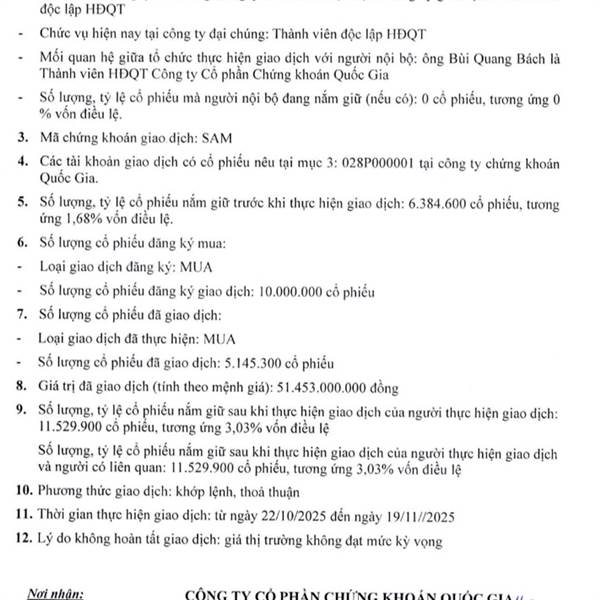 Công ty Cổ phần Chứng khoán Quốc Gia báo cáo kết quả giao dịch cổ phiếu của tổ chức có liên quan đến Người nội bộ Công ty Cổ phần SAM Holdings như sau: