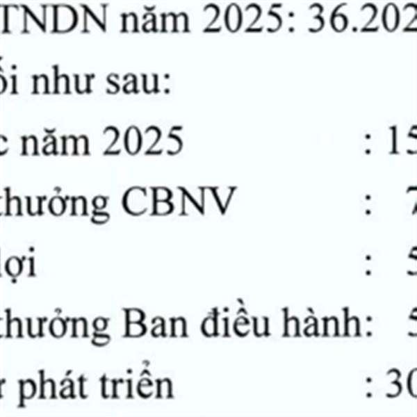 Kế hoạch 2026 nếu được như này thì cũng tạm ổn. LNST 2026 khoảng 28 tỷ. Trừ khen thưởng phúc lợi 17% thì còn 23 tỷ. Cổ tức 2025 chia 15%.