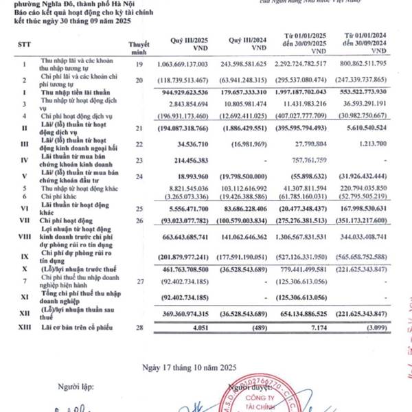 Trong quý 3 năm 2025, EVF tiếp tục ghi nhận kết quả kinh doanh khả quan với tổng thu nhập hoạt động đạt 708 tỷ đồng, tăng 96% so với cùng kỳ, và lợi nhuận sau thuế đạt 254 tỷ đồng, tăng 40% so với năm...Thêm