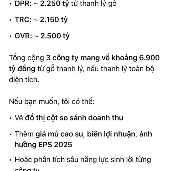 Biểu đồ đã được vẽ xong — so sánh doanh thu thanh lý gỗ của DPR, TRC và GVR dựa trên đơn giá 250 triệu/ha.