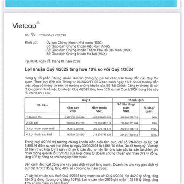 VCI LNST Quý 4: 443ty (hơn gấp đôi cùng kỳ). LNST 2025 đạt 1.342 tỷ (vs 910ty 2024)