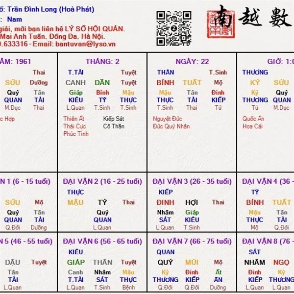 Lá số bát tự chú Trần Đình Long (toàn tài tinh) 1. Tổng thể mệnh cục • Nhật chủ Bính Hỏa sinh mùa xuân (tháng Dần) → Hỏa yếu (vì bị Mộc khắc, Thủy tiết). • Nhưng trong tứ trụ lại có Tuất (Thổ), Sửu (Th...Thêm