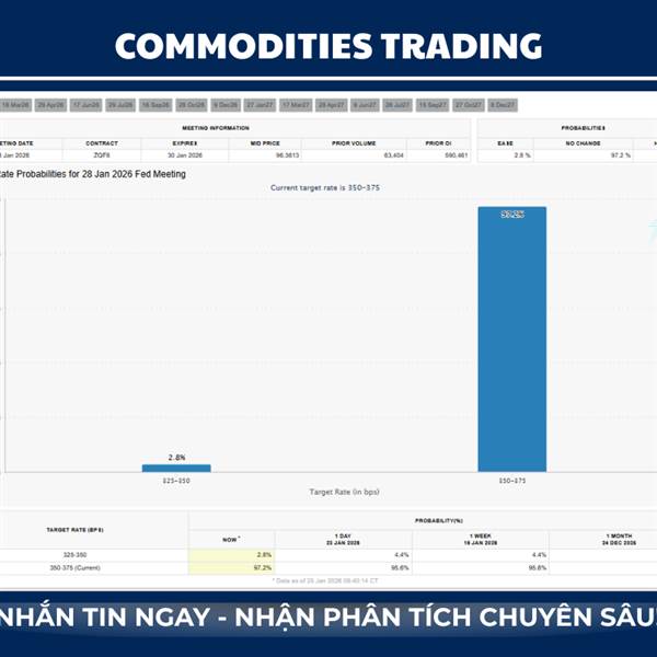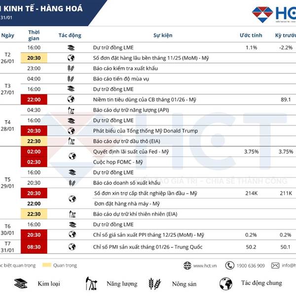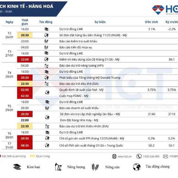 LỊCH KINH TẾ HÀNG HÓA TUẦN 26/01/2026 🔹 Thứ 3 (22:00): Niềm tin tiêu dùng của CB tháng 01/26 - Mỹ 🔹 Thứ 4 (20:30): Tổng thống Trump phát biểu – Rủi ro địa chính trị/thuế quan 🔹 Thứ 5 (02:00): Quyết đị...Thêm
