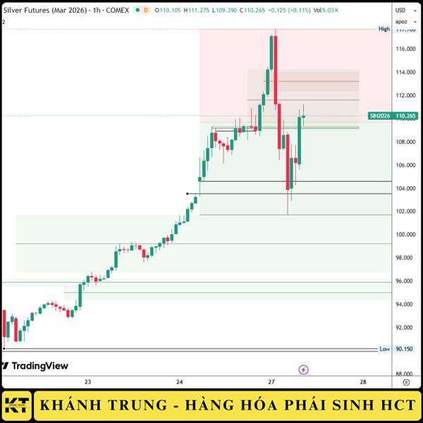 Cập nhật Bạc SILH26 ngày 27/01/2026 ---------- * Bạc trong phiên hôm qua đã tạo đỉnh mới tại 117.700 USD. Và gặp áp lực chốt lời mạnh kéo giá về 104 USD. * Dự kiến nhịp hồi kiểm đỉnh lại quanh 114 USD. ...Thêm