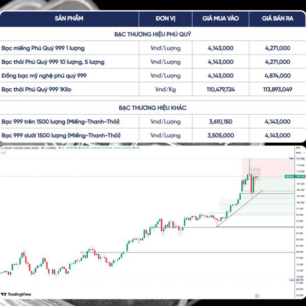 BẠC ĐIỀU TIẾT CUNG - CẦU SAU ĐÀ TĂNG MẠNH, NÊN LÀM GÌ? Cập nhật và Nhận định giá Bạc ngày 27/01/2026 ------- I. Giá bạc mới nhất ▪ Trong nước: Mua vào 110 – Bán ra 114, tiếp tục duy trì vùng giá cao. ▪ 7 n...Thêm