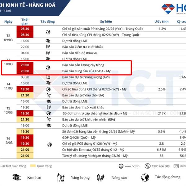 Anh chị giao dịch nông sản chú ý khung giờ lúc 23h00 ngày 10/03/2026, Bộ Nông nghiệp Hoa Kỳ (USDA) sẽ phát hành Báo cáo Cung cầu nông sản thế giới (WASDE). Báo cáo WASDE có thể ảnh hưởng lớn tới thị tr...Thêm