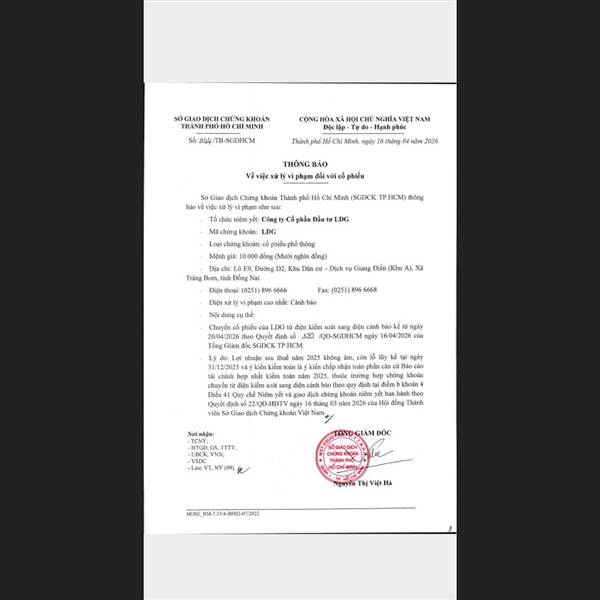 Sở Giao dịch Chứng khoán TP.HCM công bố Quyết định về việc chuyển cổ phiếu Công ty Cổ phần Đầu tư LDG từ diện kiểm soát sang diện cảnh báo kể từ ngày 20/04/2026 như sau: