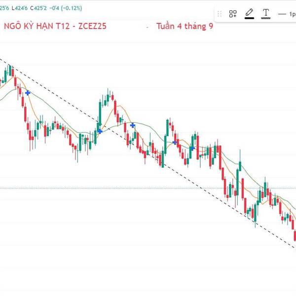 NGÔ kỳ hạn tháng 12/2025 - Ngày 26/09 Trước đó giá ngô giảm khá mạnh, Hiện tại giá đang dao động quanh vùng 424 – 425, tiệm cận đường MA50 và MA100, cũng như đang kiểm định lại trendline ngắn hạn vừa b...Thêm