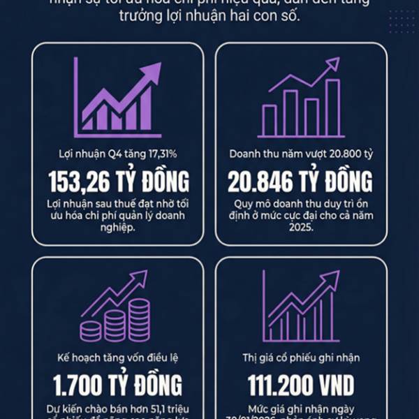 📊 Lợi nhuận sau thuế quý 4 đạt 153,26 tỷ đồng (+17,31% svck). Lũy kế cả năm 2025, doanh thu cán mốc 20.847 tỷ đồng, lãi ròng đạt gần 405 tỷ.