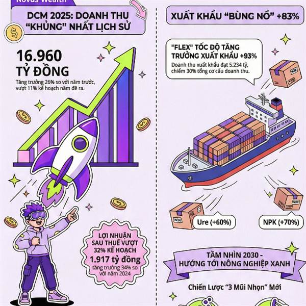 DCM lập kỷ lục doanh thu năm 2025 với 16.960 tỷ đồng (+26%) và lãi ròng 1.917 tỷ đồng (+34%), vượt 32% kế hoạch lợi nhuận. Động lực chính là mảng xuất khẩu tăng đột biến 83% (đạt 5.234 tỷ đồng)...Thêm