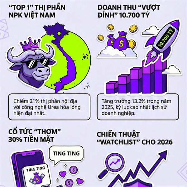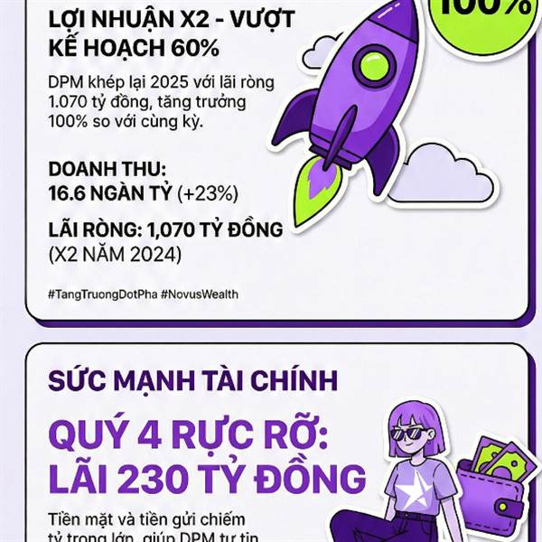 Năm 2025, DPM ghi nhận lãi ròng hơn 1,070 tỷ đồng, gấp đôi năm trước và vượt 60% kế hoạch nhờ quý 4 lãi lớn 230 tỷ đồng. Công ty sở hữu tài chính lành mạnh với hơn 9 ngàn tỷ đồng tiền mặt, đảm b...Thêm