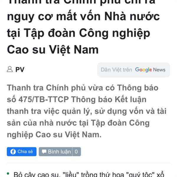 Thanh tra chính phủ vừa điều tra tập đoàn cao su vn và chỉ ra một loạt sai phạm, trong đó có nội dung trích ĐTPT tùm lum và không chia hết LNST theo đúng luật: "Bên cạnh đó, các Công ty thuộc Tập đoà...Thêm