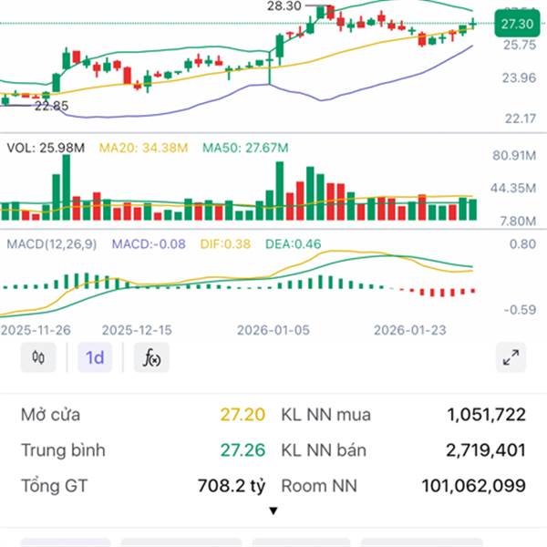 • Giá vẫn dưới/áp sát dải giữa Bollinger ~20.80, lự...Thêm