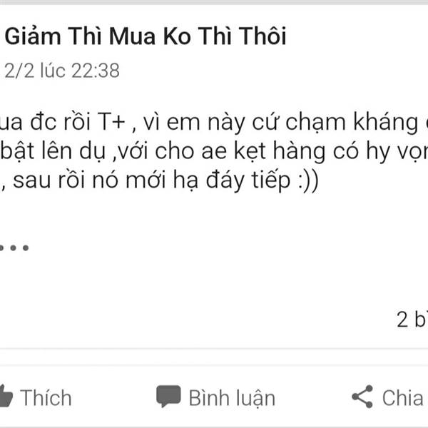 Mai mua đc rồi T+ , vì em này cứ chạm kháng cự với đáy là bật lên dụ ,với cho ae kẹt hàng có hy vọng rồi ko cắt , sau rồi nó mới hạ đáy tiếp :))