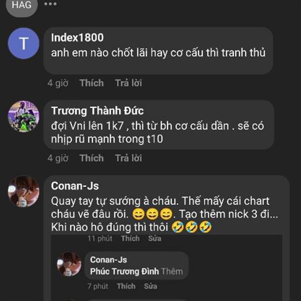 Lại thêm cháu hô hào mõm rồi xoá bài. 🤣🤣🤣. Các cháu mồm thì bảo rừng rũ nhưng lại dụ dỗ đừng bán. Thế ko bán thì rũ kiểu gì?. Rồi lắm cháu mồm hô mua tay đặt bán, vẽ vời các kiểu. Các cháu mà biết ...Thêm