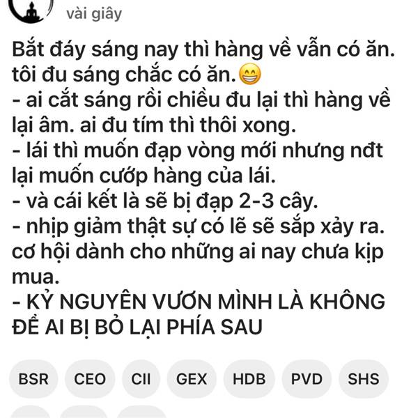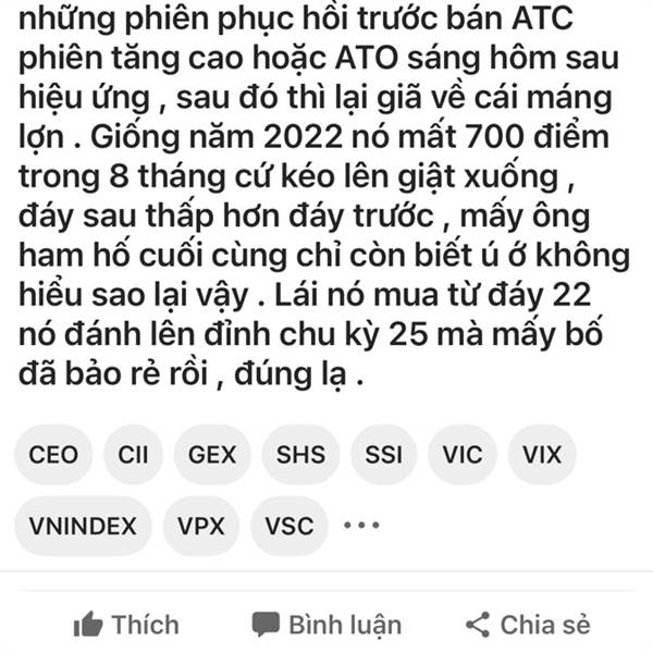 "Mai ông nào khôn thì bán hết phiên ATO lúc đó sẽ có giá cao nhất , vẫn như những phiên phục hồi trước bán ATC phiên tăng cao hoặc ATO sáng hôm sau hiệu ứng , sau đó thì lại giã về cái máng lợn ...Thêm