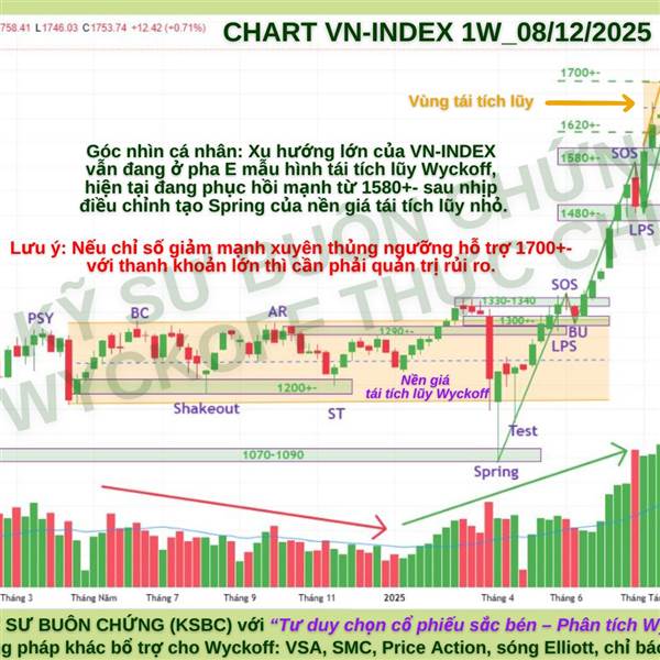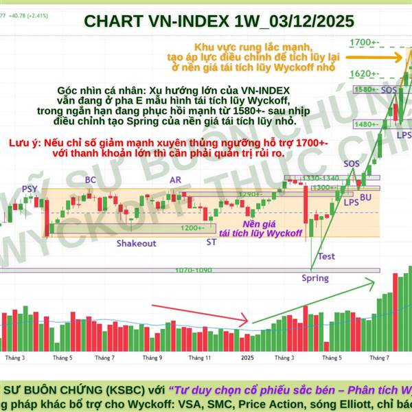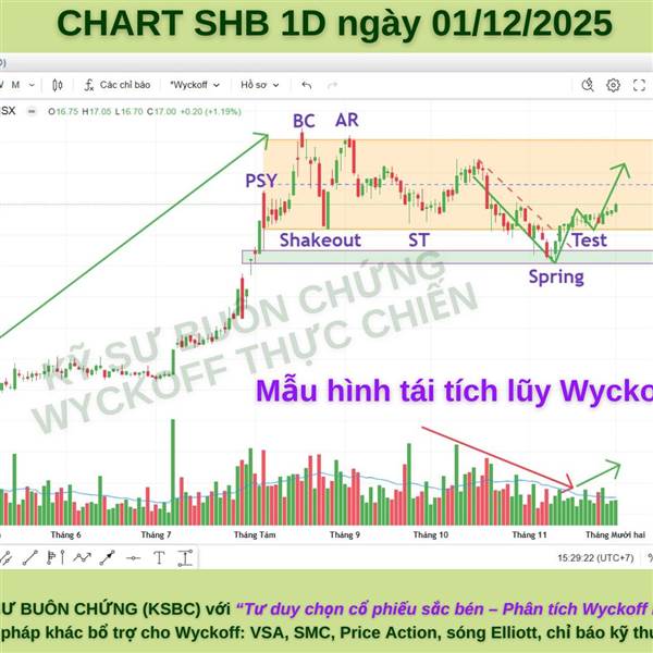 SHB vẫn là cái tên nổi bật trong nhóm bank trong phiên hôm nay (ngày 01/12/2025): Sau nhịp rũ bỏ (Spring), SHB vẫn túc tắc đi lên và giữ giá rất tốt trong mẫu hình tái tích lũy Wyckoff như đã phân tíc...Thêm